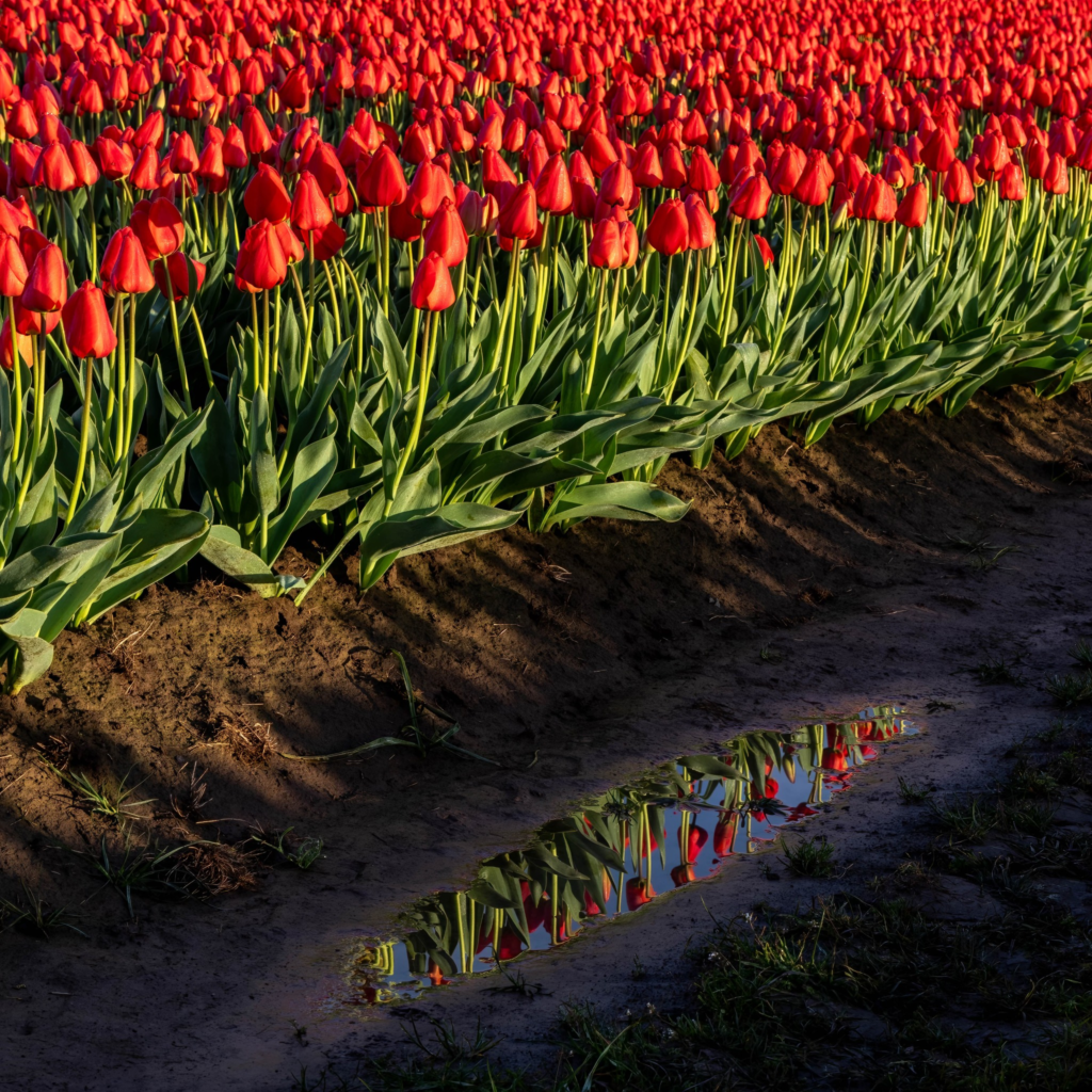 Caption: Water Puddle Reflections – Tulip fields at the Wooden Shoe Tulip Farm in Oregon