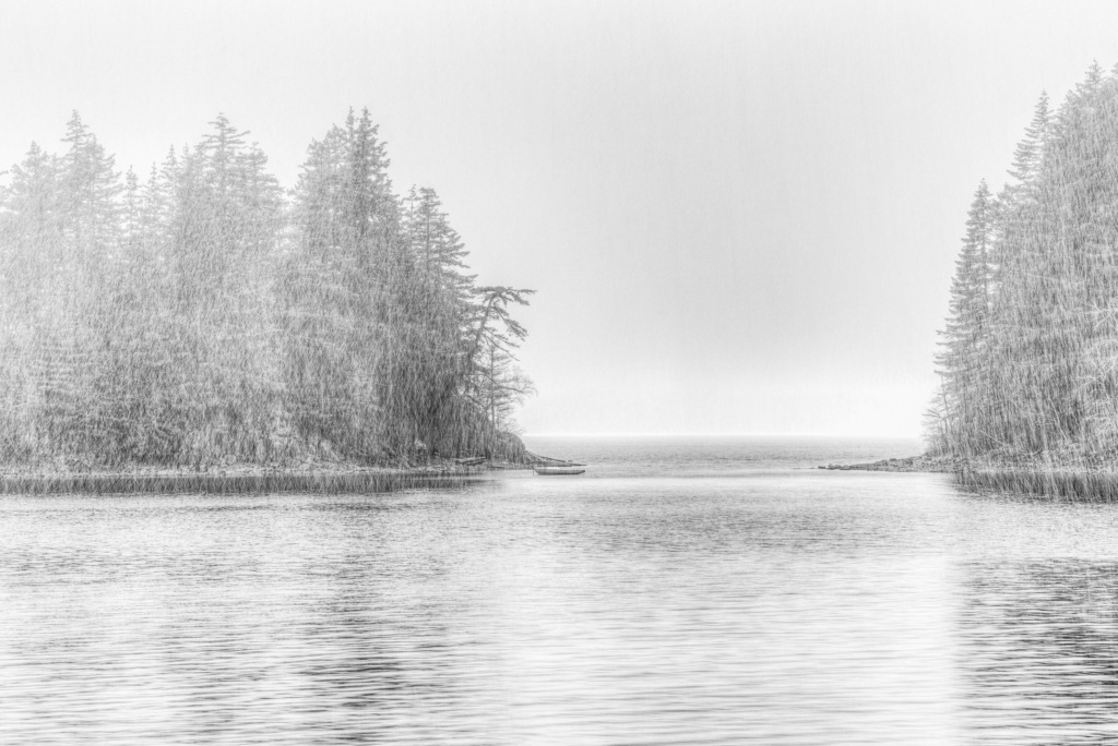 Caption: High key shot in Harrison Hotsprings, BC Canada (Canon EOS 6D, f/11, 2/5th second , ISO 100 on a tripod) The rain was bucketing down and my photography buddy & I got drenched BUT it was worth every second to get this High Key shot of the rain pelting down on Harrison Lake. (High Key images have few shadows and the scenes are intentionally over exposed)