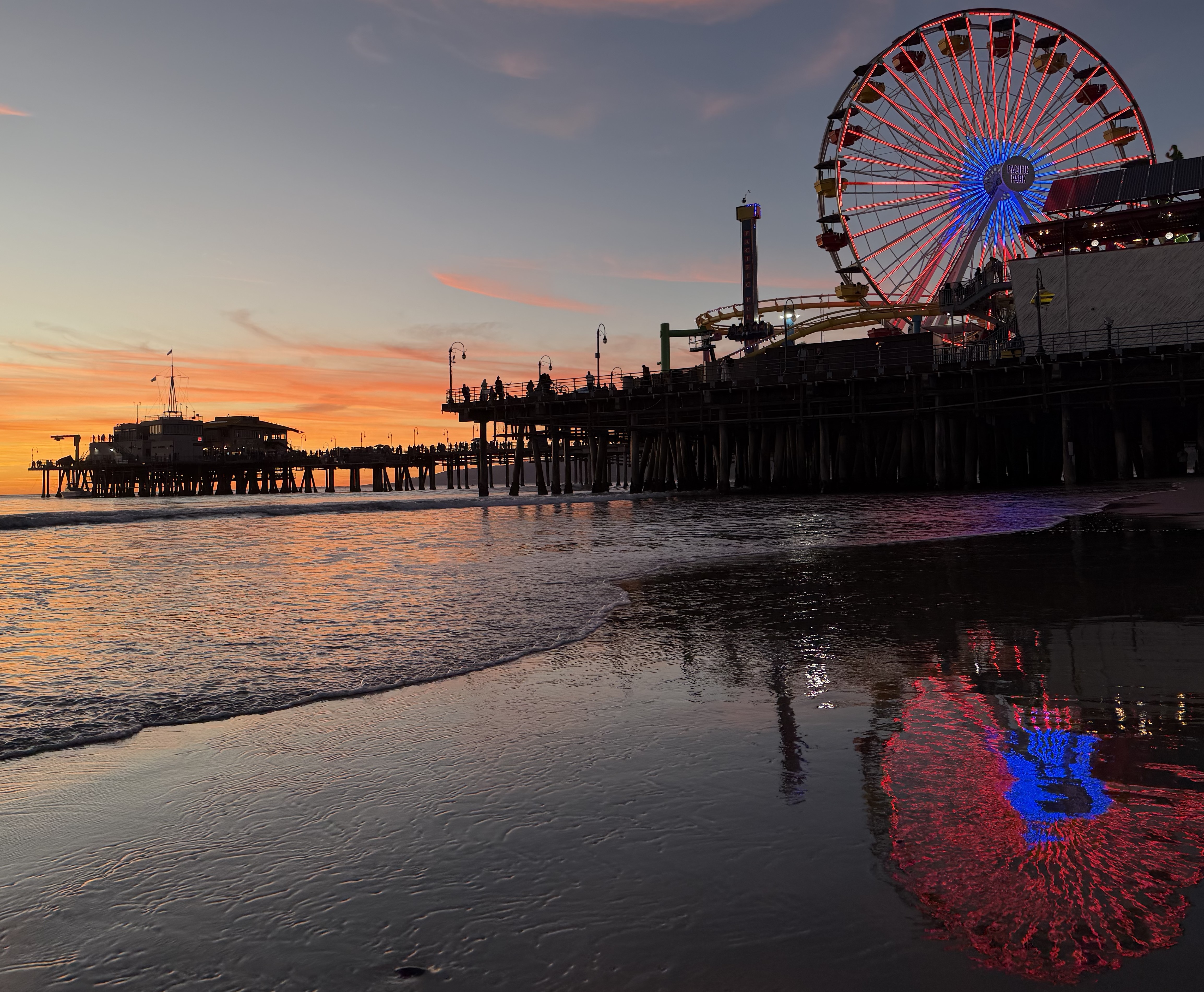 When taking this photo, I took into account some guidance Scott provided me: (1) waiting for the waves to recede to form the glassy film on the sand (but not wait too long!), (2) but also taking into account the edge of the wave as it formed a line towards the Ferris wheel, and (3) try to use the Rule of Thirds in framing my subject (the Ferris wheel).