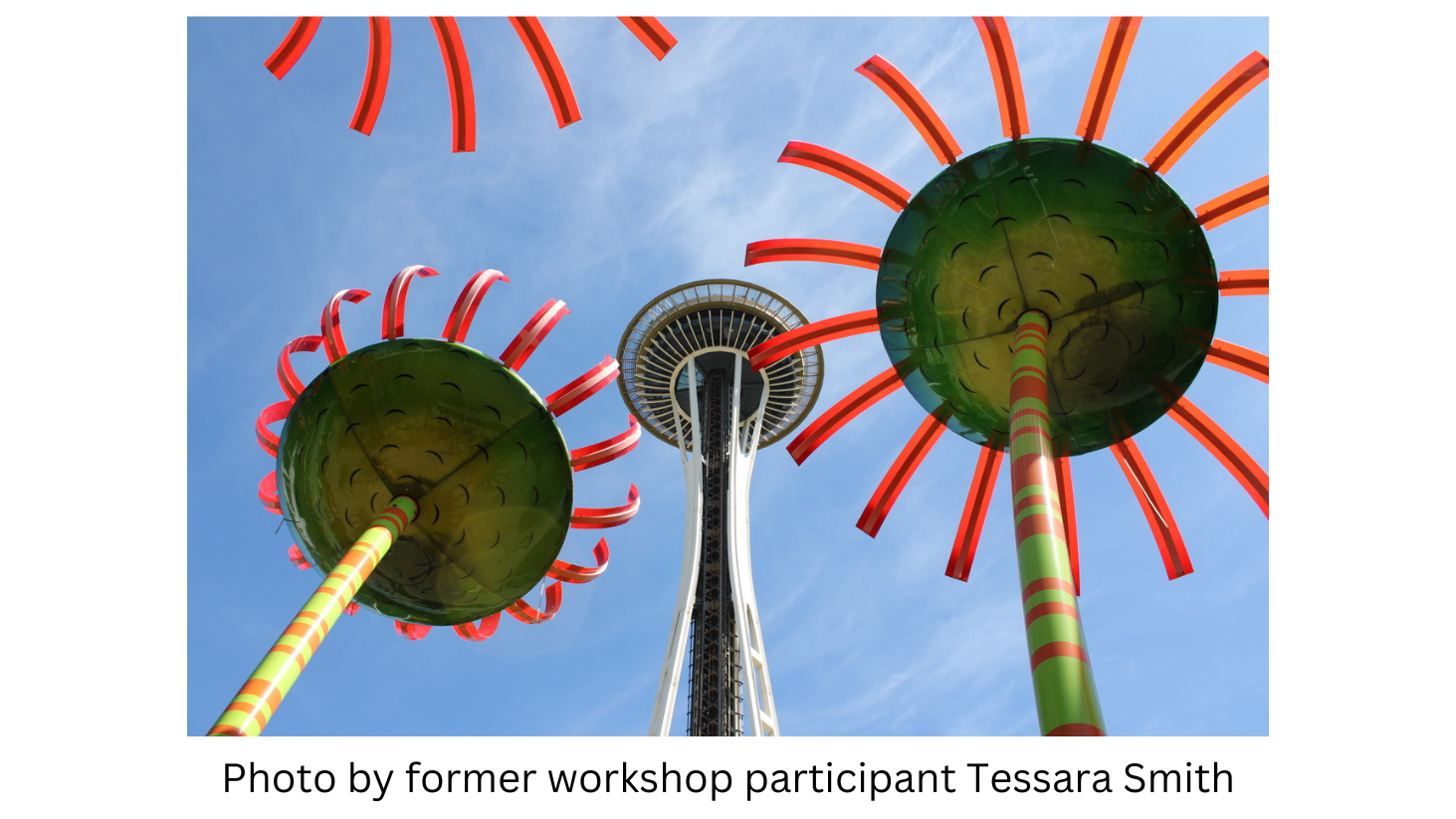 If you get to the movies, even infrequently, you have seen the famous Seattle Space Needle and it is a photo op no doubt and your DPA Photo Instructor will share all sorts of camera angles and composition strategies to render a compelling image of the iconic structure, so it transcends the snapshot category. But there is a lot more than the Space Needle to photograph at Seattle Center. There is an array of colorful and whimsical oversized sculptures to catch as sole photographs or try creating a visual interplay amongst more than one. Besides the gigantic sculptures, there is also the dizzying collection of eclectic architectural styles in the buildings and skyscrapers side by side.